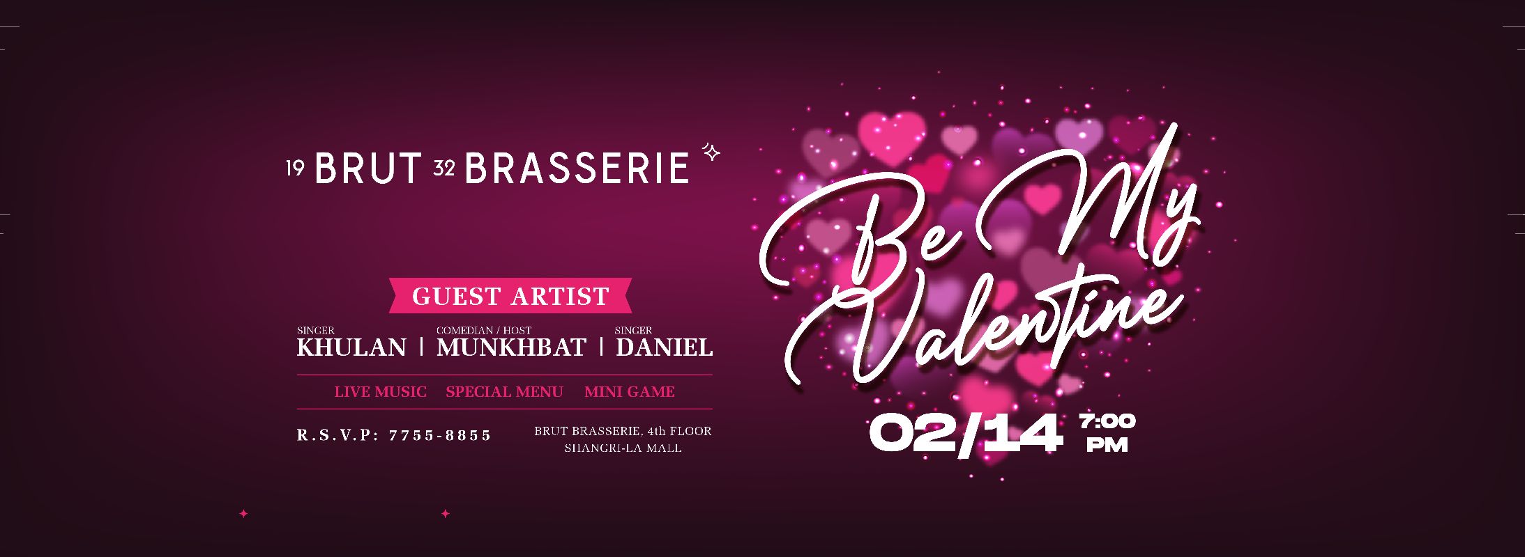 Гэгээн хайрын баярыг их хотын төвд байрлах "Brut 19'32 Brasserie" ресторанд хайрттайгаа хамт дурсамж дүүрэн тэмдэглэн өнгөрүүлээрэй.