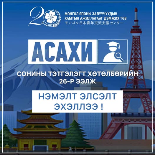 Япон улсад ажиллангаа суралцах боломжийг оюутан залууст өгдөг Асахи Сонины Тэтгэлэгт хөтөлбөрийн бүртгэл эхэллээ. Тэтгэлэгт хөтөлбөрийн агуулга нь АСАХИ сонин борлуулах цэгт өглөө, оройн сонин тараах ажил хийхийн зэрэгцээ Япон хэлний сургуульд 2 жилийн хугацаатай 100%-ийн тэтгэлгээр суралцах тогтолцоо юм.