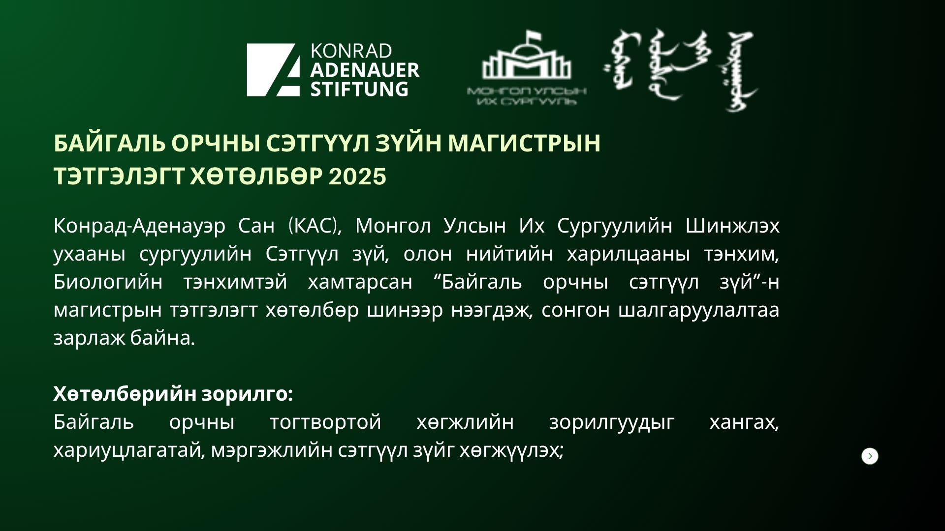 Конрад-Аденауэр Сан, Монгол Улсын Их Сургуулийн Шинжлэх ухааны Сэтгүүл зүй, олон нийтийн харилцааны тэнхим, Биологийн тэнхимтэй хамтарсан "Байгаль орчны сэтгүүлзүй"-н магистрын тэтгэлэгт хөтөлбөр шинээр нээгдэж, сонгон шалгаруулалтаа зарлалаа.