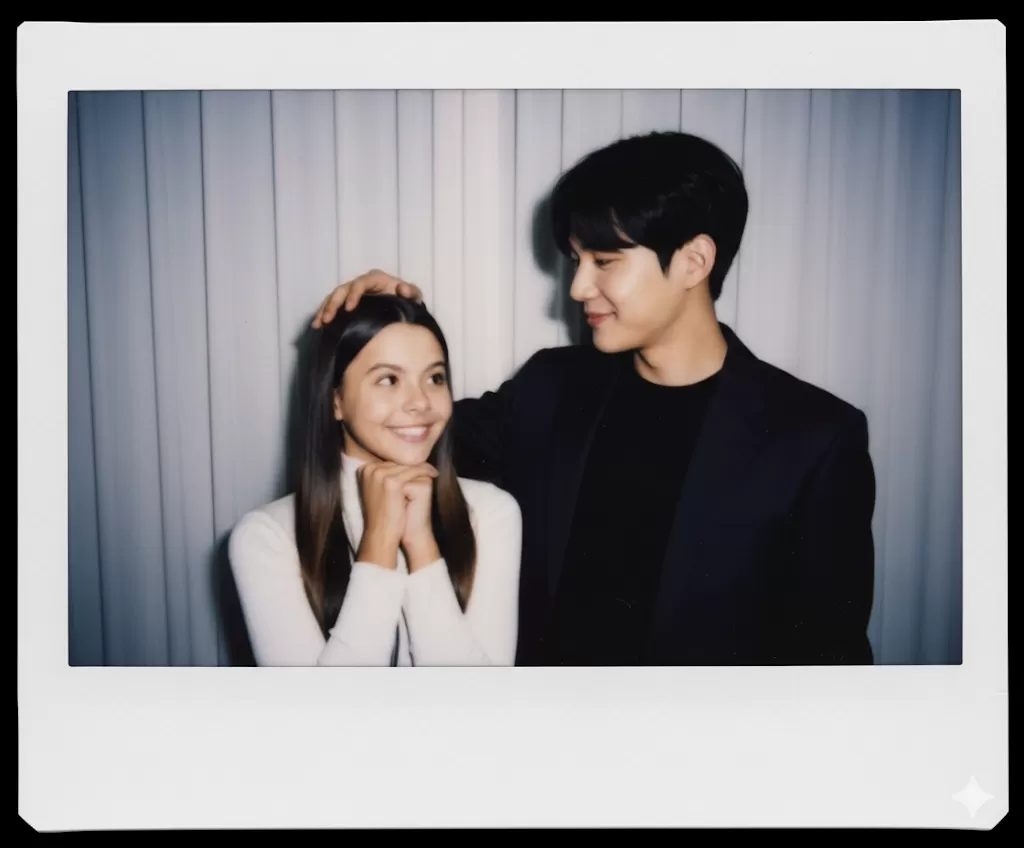 "Take a picture with a Polaroid camera. The photo should look like a normal photo, without any clear subjects or props. The photo should have a slight blur effect and a consistent light source, such as a flash from a dark room, spread throughout the photo. Do not change the faces. Replace the background behind the two people with a white curtain. With the guy being close to me like a couple. Don't change the angle of our faces."