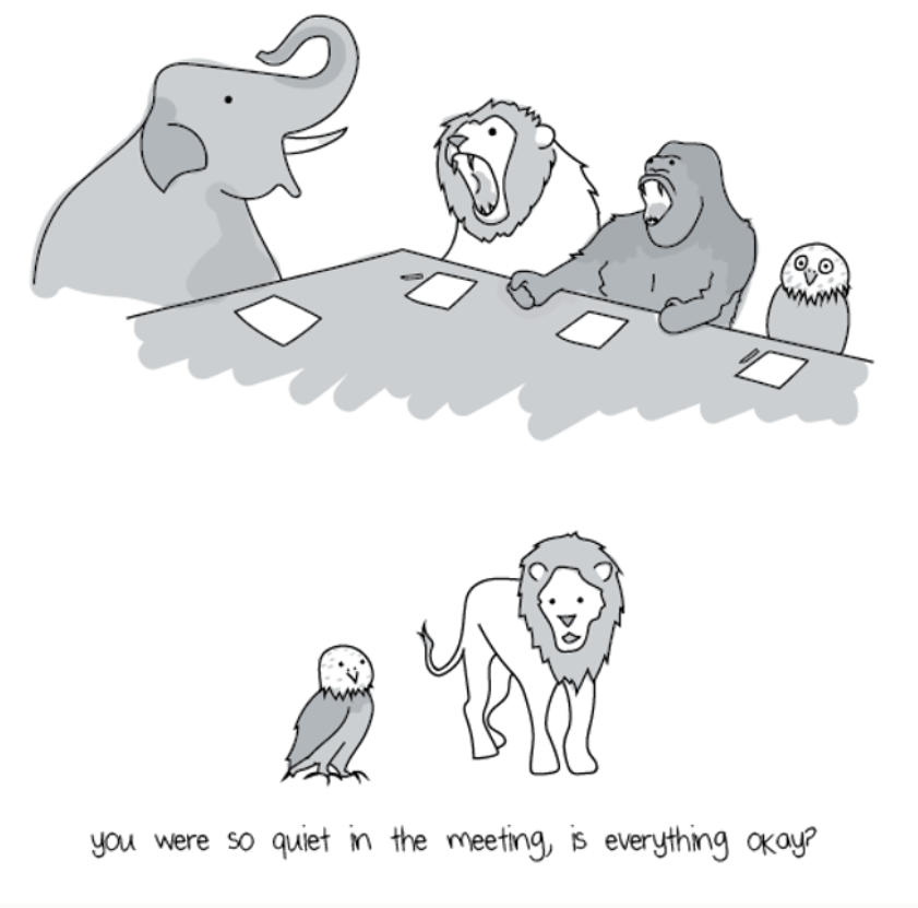 Интровертууд нь ихэвчлэн чадварлаг сонсогчид бөгөөд харилцан ярианд оролцохын өмнө мэдээллийг ажигладаг. Тэд өөрийн үзэл бодлыг хуваалцахаасаа өмнө бусдын үзэл бодлыг ойлгох хүсэл эрмэлзэлтэй байдаг. Интроверт хүмүүсийн нам гүм байдал нь тэдний анхааралтай, бодолтой байдлын шинж тэмдэг. Интроверт хүмүүсийг өөрийн үзэл бодол, санал бодлоо хуваалцахад урамшуулан дэмжээрэй, гэхдээ тэднийг бэлэн болохоос нь өмнө үг хэлэхийг нь шахахаас зайлсхий.