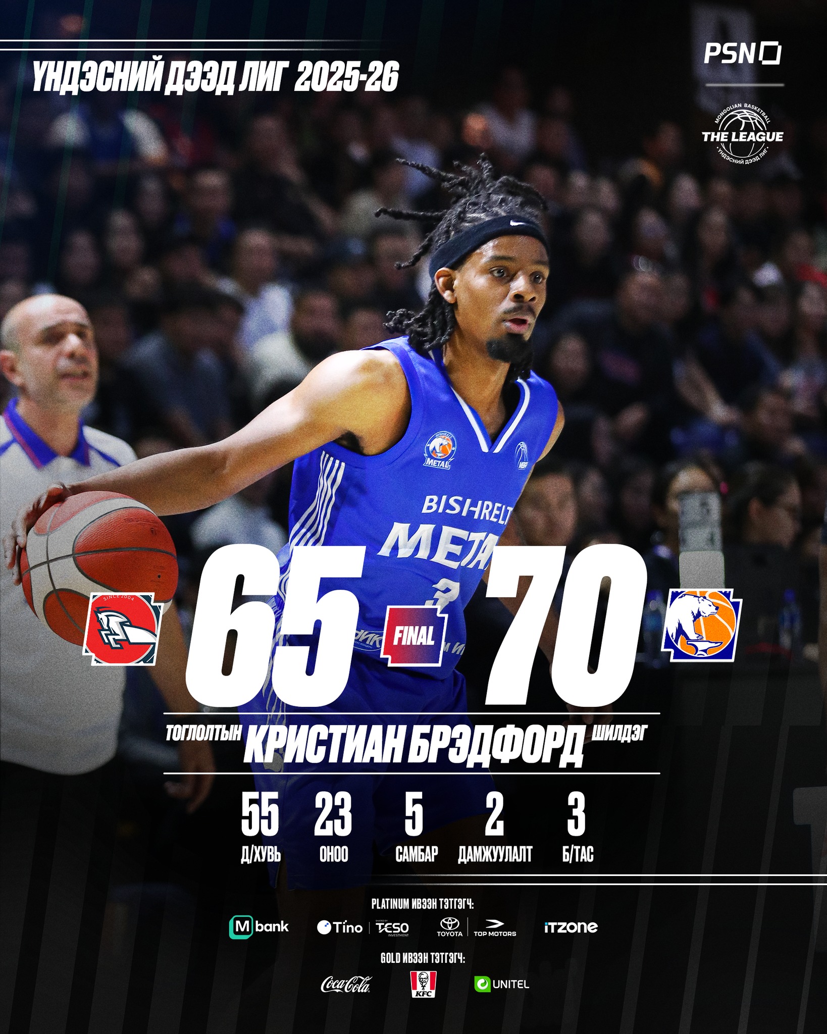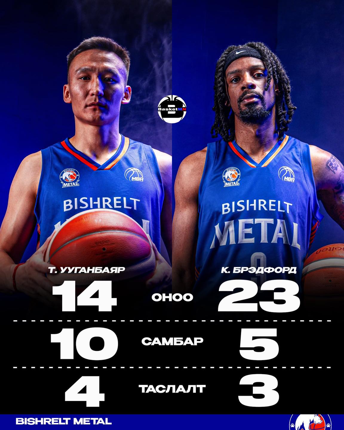 Мөн тус тоглолтын онцлох тоглогчид Бишрэлт Метал багийн Т.Ууганбаяр, Б.Бредфорд нар байв. Т. Ууганбаяр 14 оноо, 10 самбар, 4 таслалт хийсэн бол Б.Бредфорд 23 оноо, 5 самбар, 3 таслалт тус тус хийжээ.