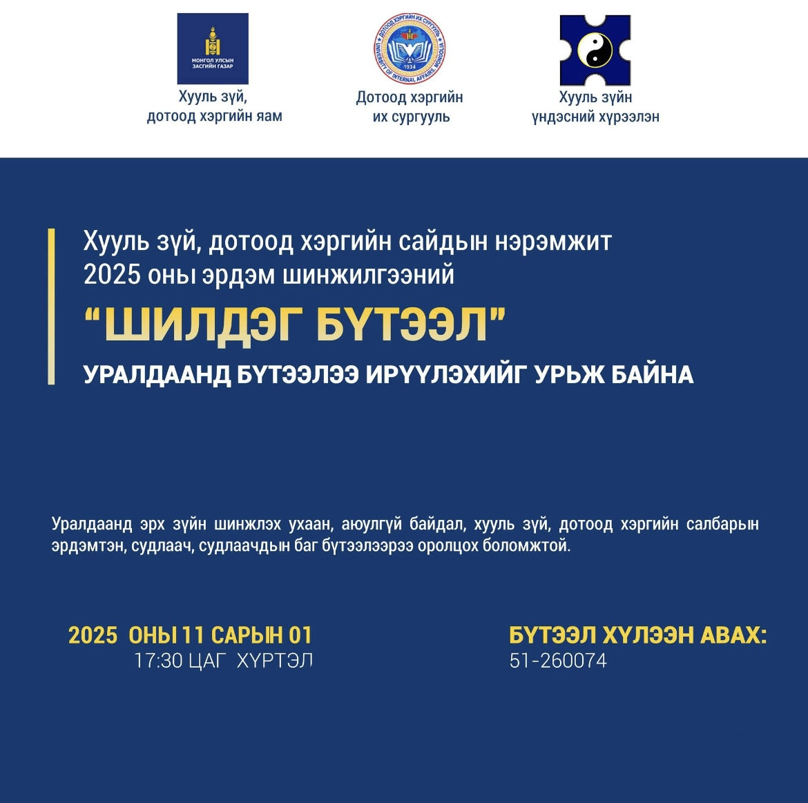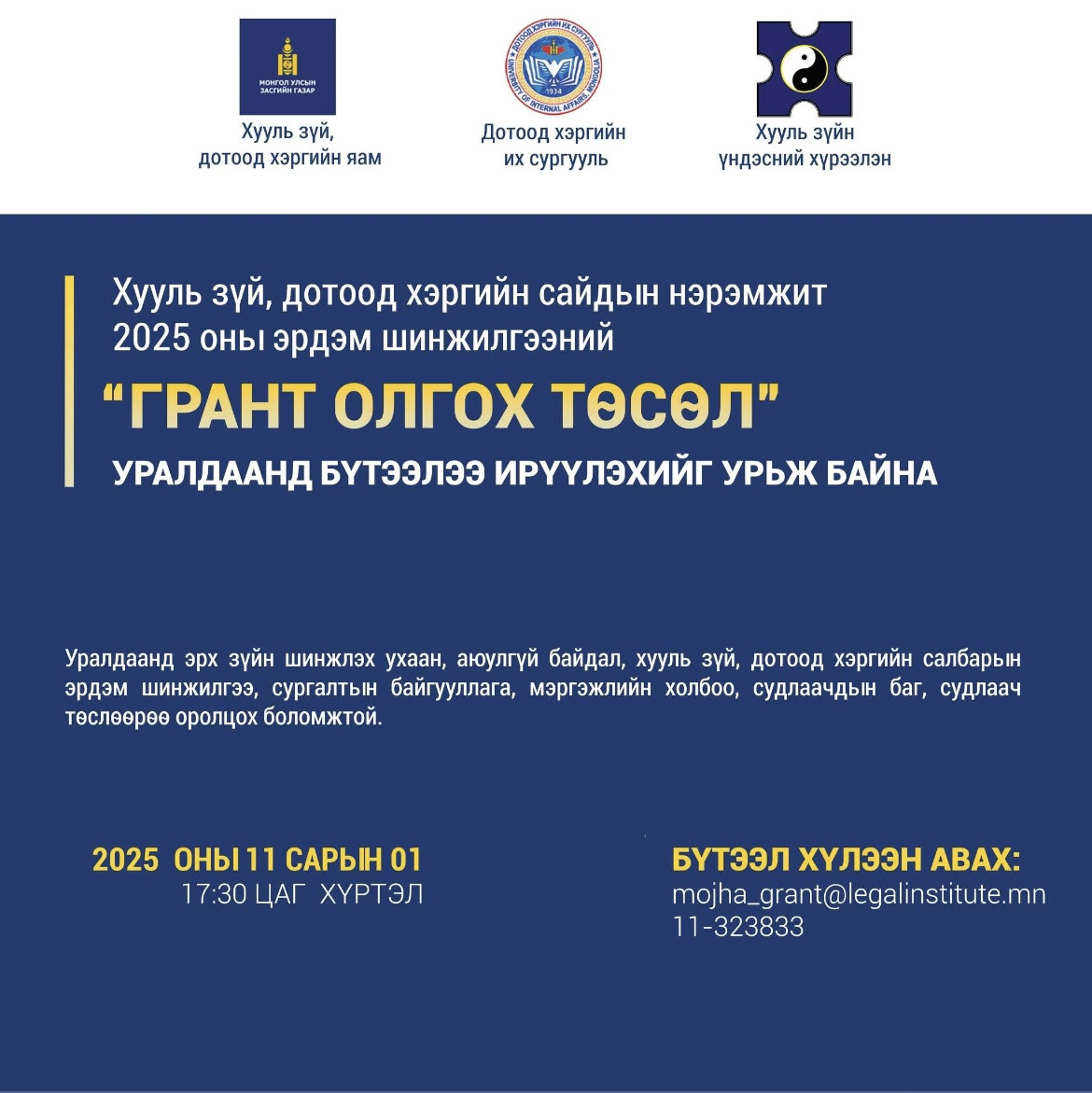 Хууль зүй, дотоод хэргийн сайдын нэрэмжит 2025 оны эрдэм шинжилгээний "ГРАНТ ОЛГОХ ТӨСӨЛ" уралдаанд бүтээлээ ирүүлэхийг урьж байна.