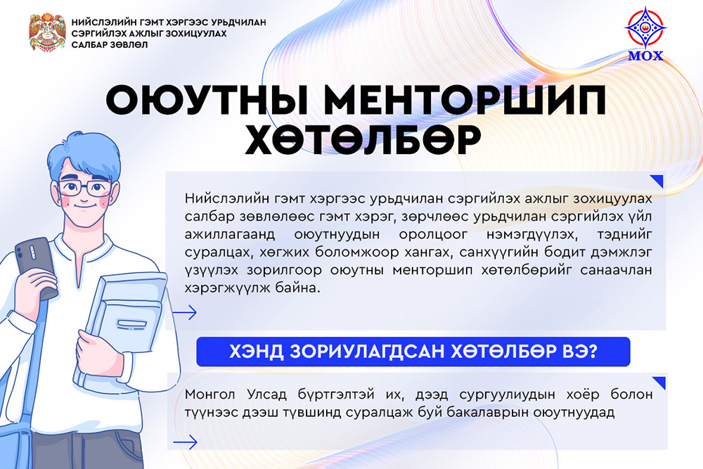 Нийслэлийн гэмт хэргээс урдчилан сэргийлэх ажлыг зохицуулах салбар зөвлөлөөс гэмт хэрэг, зөрчлөөс урьдчилан сэргийлэх үйл ажиллагаанд оюутнуудын оролцоог нэмэгдүүлэх, тэднийг суралцах, хөгжих боломжоор хангах, санхүүгийн бодит дэмжлэг үзүүлэх зорилгоор оюутны менторшип хөтөлбөрийг санаачлан хэрэгжүүлж байна.