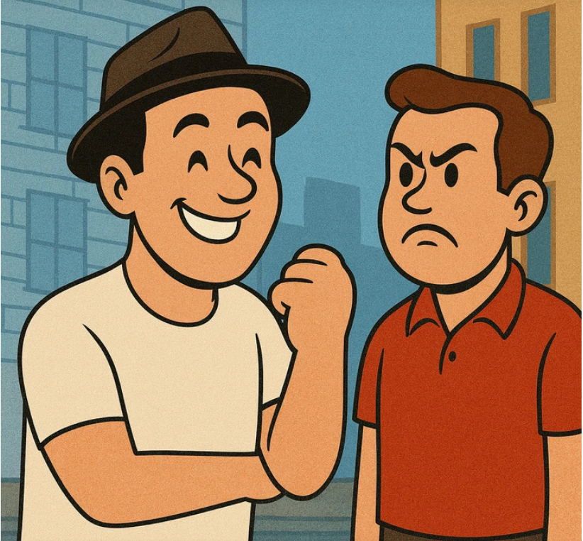 Нэг гараа нугалж нөгөө гараараа цохин, нугалсан гараа зангидсан чигээр дээш өргөх. Франц, Бразил, Өмнөд Европт энэ нь “Чамд хамаагүй” гэсэн доромж утгатай.