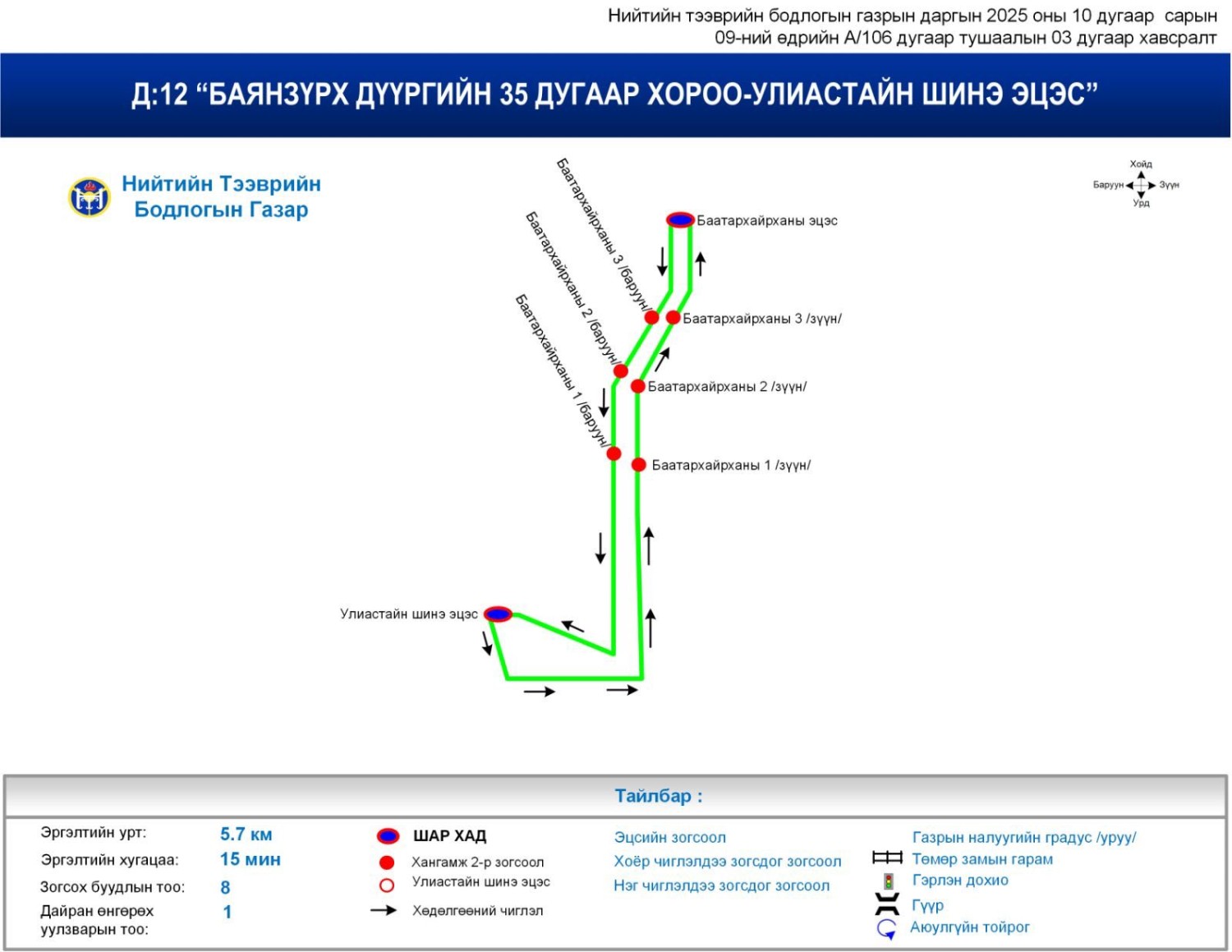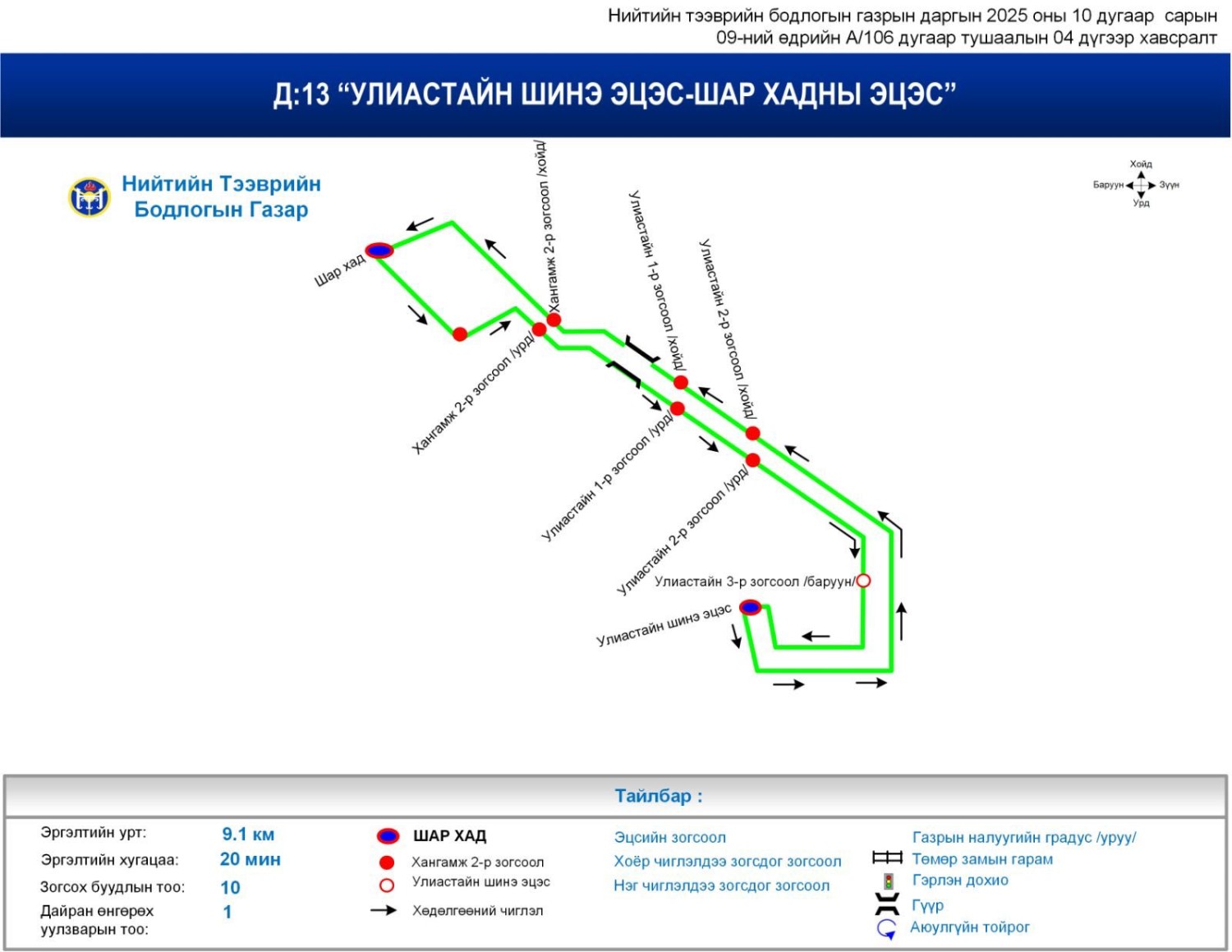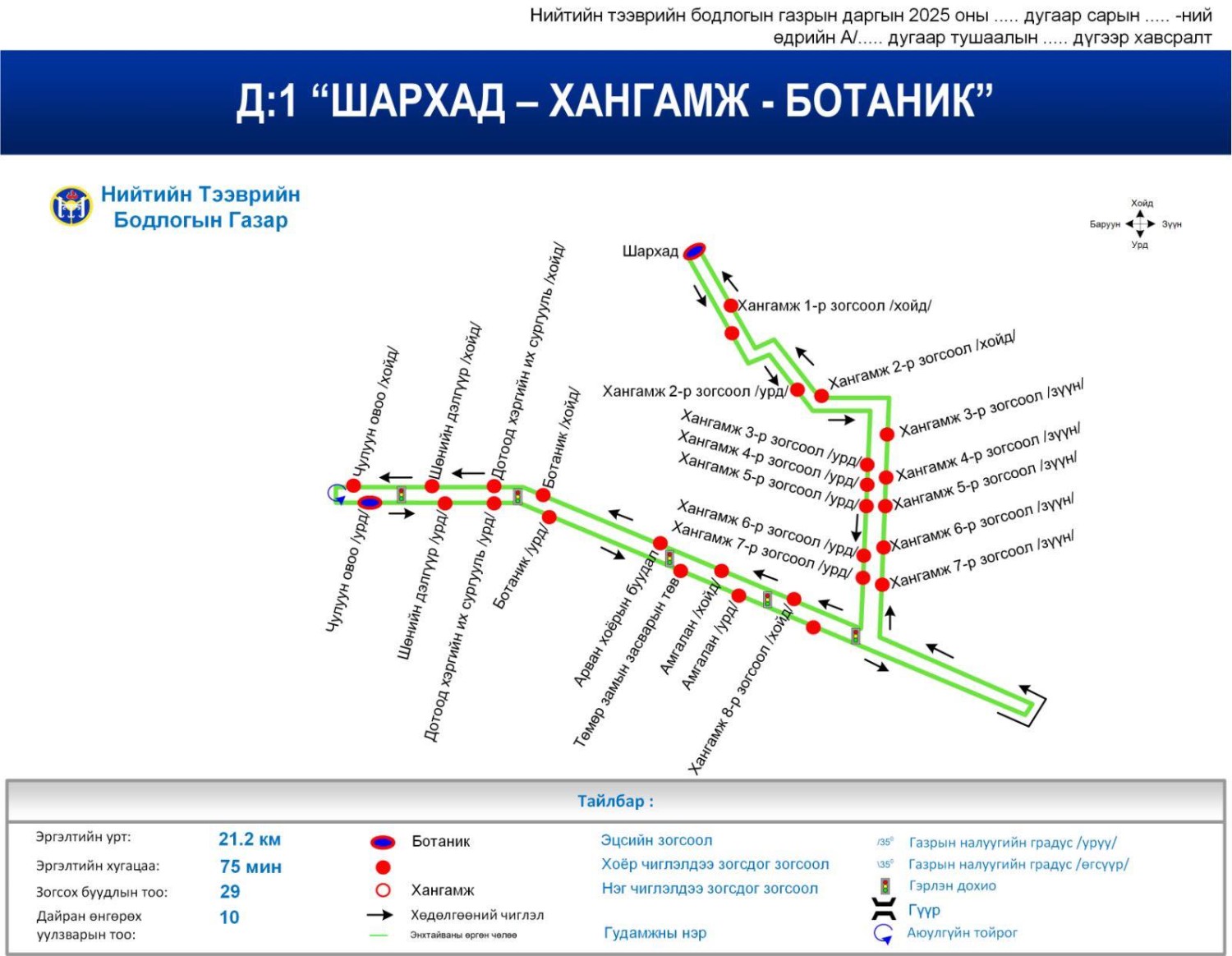 Тодруулбал, нийтийн тээврийн үйлчилгээний хүртээмжийг нэмэгдүүлж Баянзүрх дүүргийн 10 дугаар хорооны иргэдийн зорчих эрэлт хэрэгцээг хангах үүднээс нийтийн тээврийн үйлчилгээний Д :1 “Шархадны эцэс-Ботаник” чиглэлийн замналд өөрчлөлт оруулж Д :1 “Шархад-Хангамж-Ботаник” чиглэл болгон өөрчлөлт оруулав.