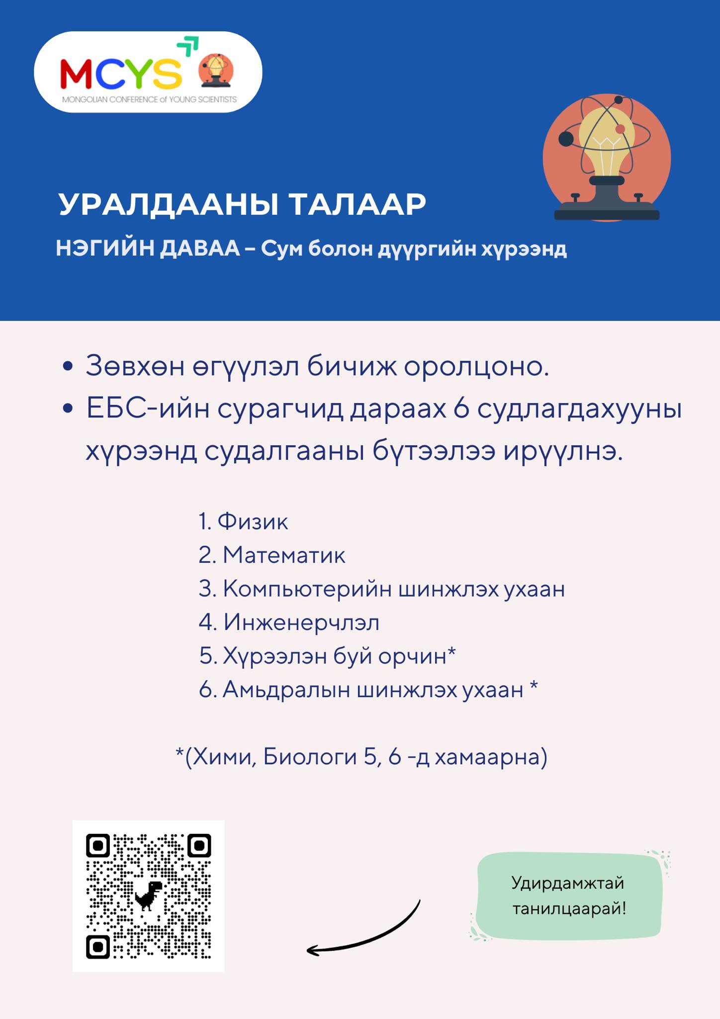 Монголын Өсвөрийн Эрдэмтдийн Анхдугаар Уралдааны сүүлийн давааны шалгаруулалтаар сурагчдыг байр эзлүүлж урамшуулахаас гадна “ICYS 2026” олон улсын уралдаанд Монгол улсаа төлөөлөн оролцох 6 сурагчийг сонгон шалгаруулах юм.