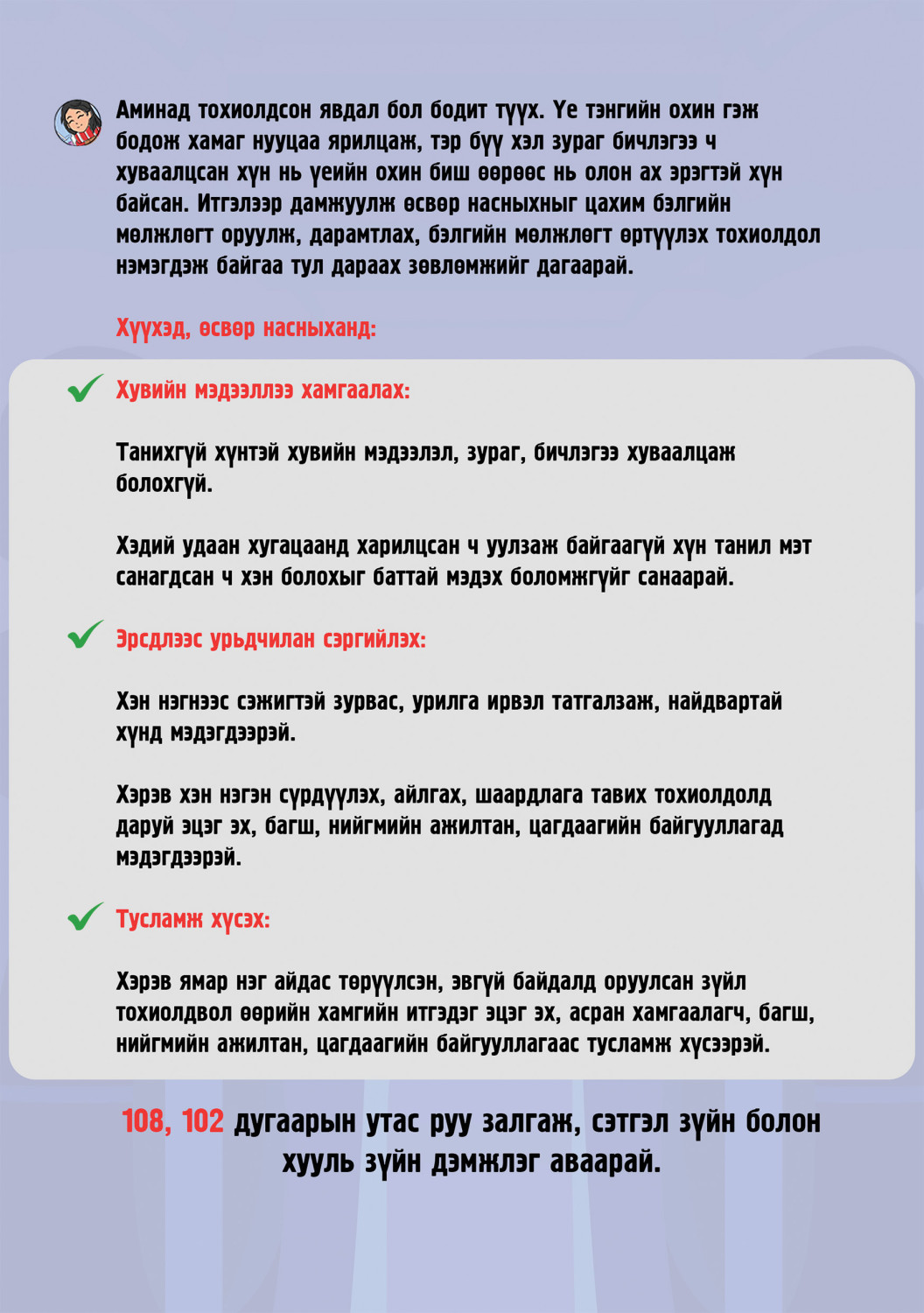 Амина охин илэн далангуй, нийтэч тул хүн бүртэй эелдэг найрсаг харьцахыг эрмэлздэг. Тэр байтугай танихгүй нэгэнтэй ч нээлттэй ярилцаж чаддаг нь түүний төрөлхийн нүүрэмгий зантай холбоотой.