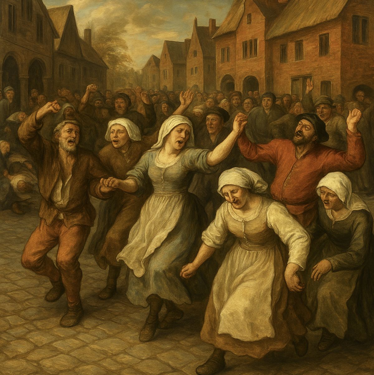 1518 оны 07 сард Фрау Троффэа хэмээх эмэгтэй гэнэт л гадаа талбайд зогсолтгүй бүжиглэж эхэлсэн нь уг тахлын эхний тохиолдол болон тэмдэглэгдэж үлджээ. Тэрээр зогсож чадалгүй тасралтгүй бүжиглэсээр ухаан алдаж унасан байна. Харамсалтай нь тэрбээр сэрсэн даруйдаа дахин ухаан алдталаа бүжиглэж эхэлсэн ба энэ байдал хэдэн өдөр үргэлжлэн, долоо хоногийн дотор нийт 30 гаруй хүмүүс Фрау Троффэа шиг өөрсдийн эрхгүй бүжиглэж эхэлсэн гэнэ.