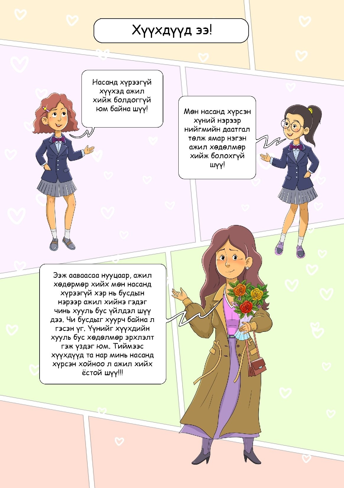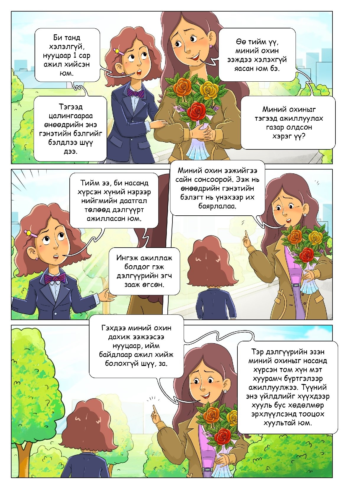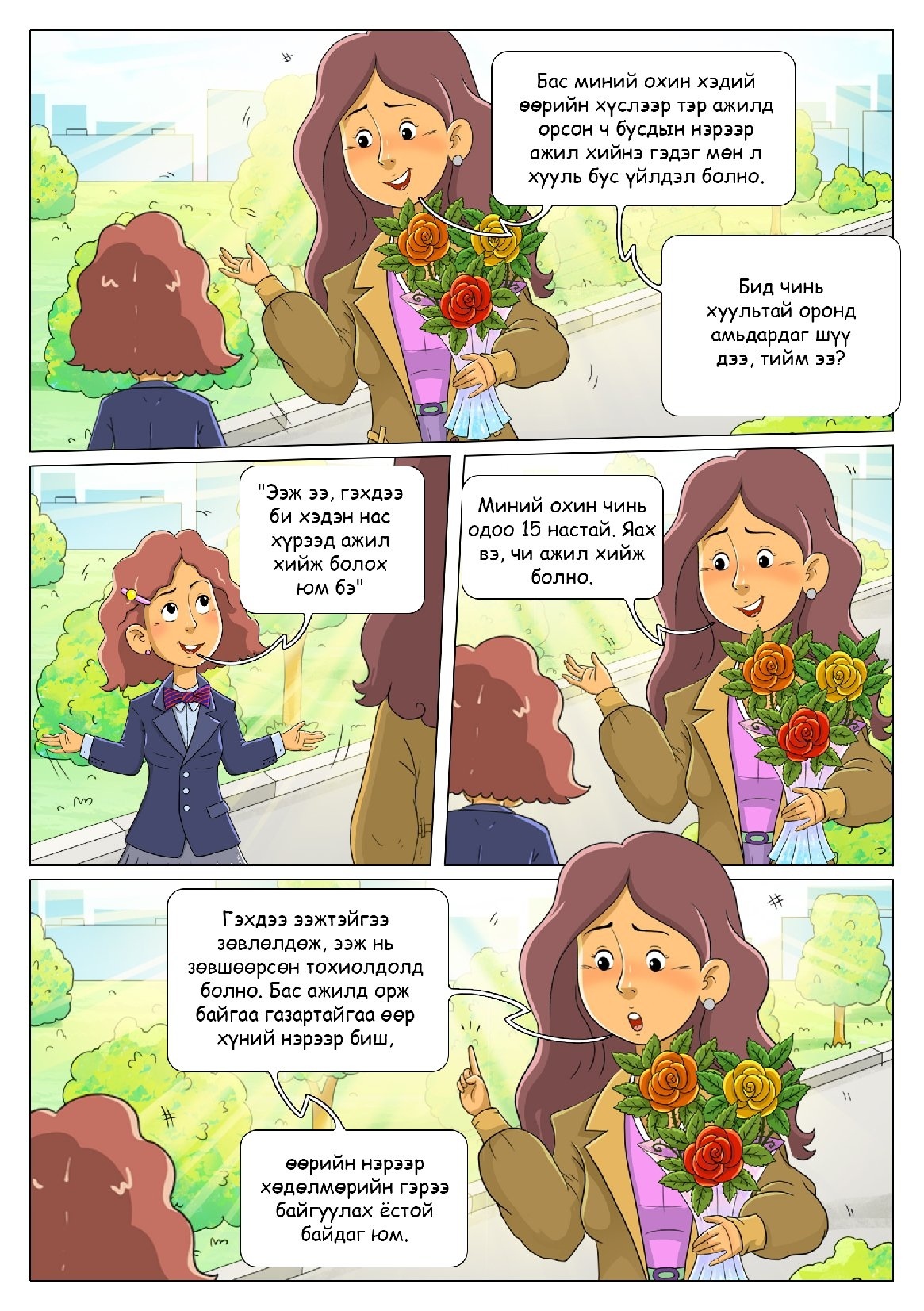 Гэвч зарим эцэг эх хүүхдээ “Ажил хийж сургана” гэх байдлаар хөдөлмөрийн насанд хүрээгүй байхад нь ажил эрхлүүлэх тохиолдол байдаг. Мөн хүүхдүүд өөрсдөө ч аав, ээж, асран хамгаалагчдадаа туслах зорилгоор бие даан шийдвэр гаргаж ажилд орох нь бий. Энэ нь хүүхдийг хөдөлмөрийн мөлжлөгт өртөх эрсдэлийг бий болгож буйг дараах комикоор сануулъя.