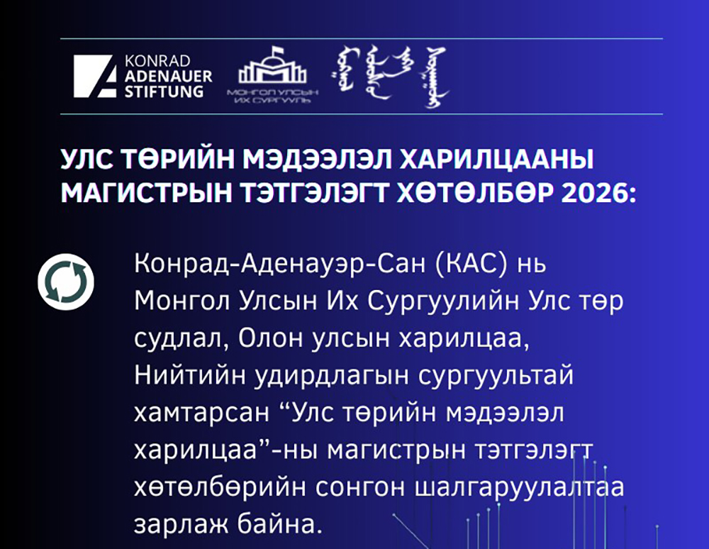 Конрад-Аденауэр-Сан (КАС) нь Монгол Улсын Их Сургуулийн УТСОУХНУС-тай хамтарсан “Улс төрийн мэдээлэл харилцаа”-ны магистрын тэтгэлэгт хөтөлбөрийн сонгон шалгаруулалтаа зарлажээ.