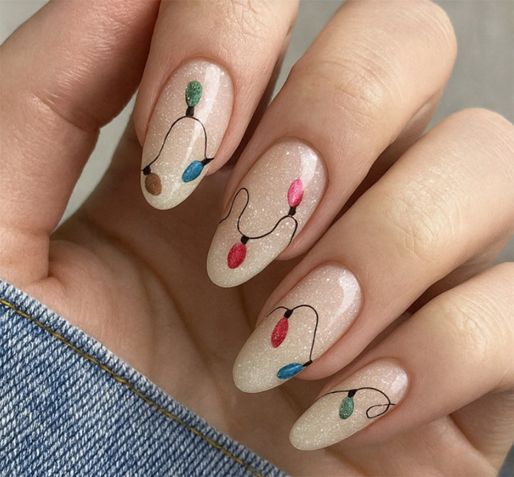 Жижигхэн гэрлийн дизайн нь маникюр болж, нимгэн суурь болон гялгар нейтрал өнгөнүүдэд тохиромжтой гялбаа нэмж өгдөг.