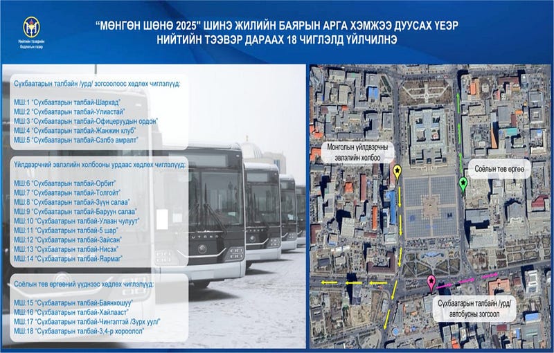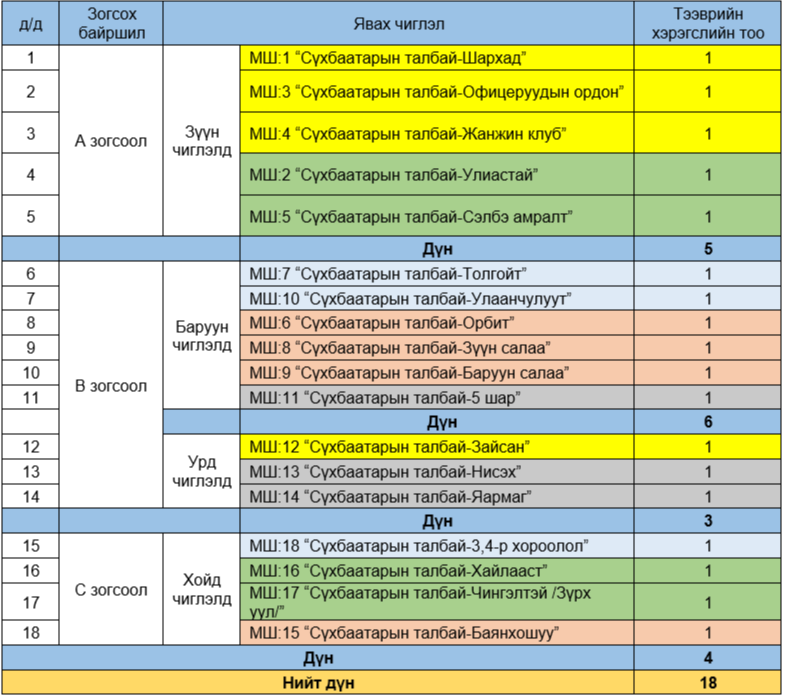 Цэнгүүний дараа 18 чиглэлд их багтаамжийн 18 автобус Сүхбаатарын талбайн баруун, зүүн болон урд зогсоол буюу зурагт тэмдэглэсэн “А”, “B”, “С” зогсоолоос суурьшлын цэгүүд рүү үнэ төлбөргүй үйлчлэхээр төлөвлөөд байна.
