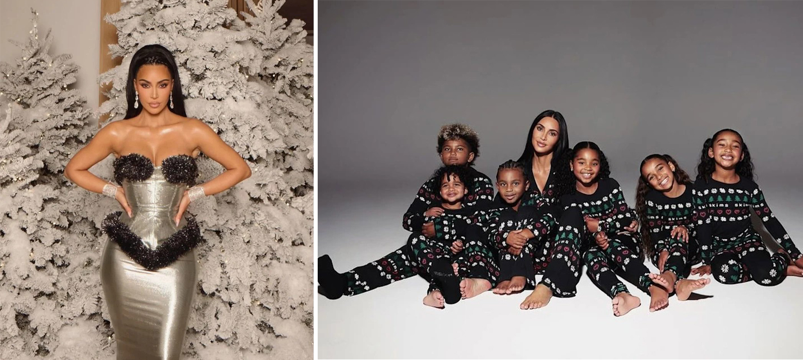 Skims хувцасны брэндийн эзэн тэрбээр цасанд хучигдсан мэт харагдах моддын өмнө мөнгөлөг бие барьсан даашинз өмссөн байсан нь түүний биеийн галбирыг тодотгон үнэхээр гайхалтай харагдаж байлаа. Мөн Kim хүүхдүүд болон авга, нагац дүү нартайгаа нэгэн жигд pajama өмссөн зургаа хуваалцсан байна.