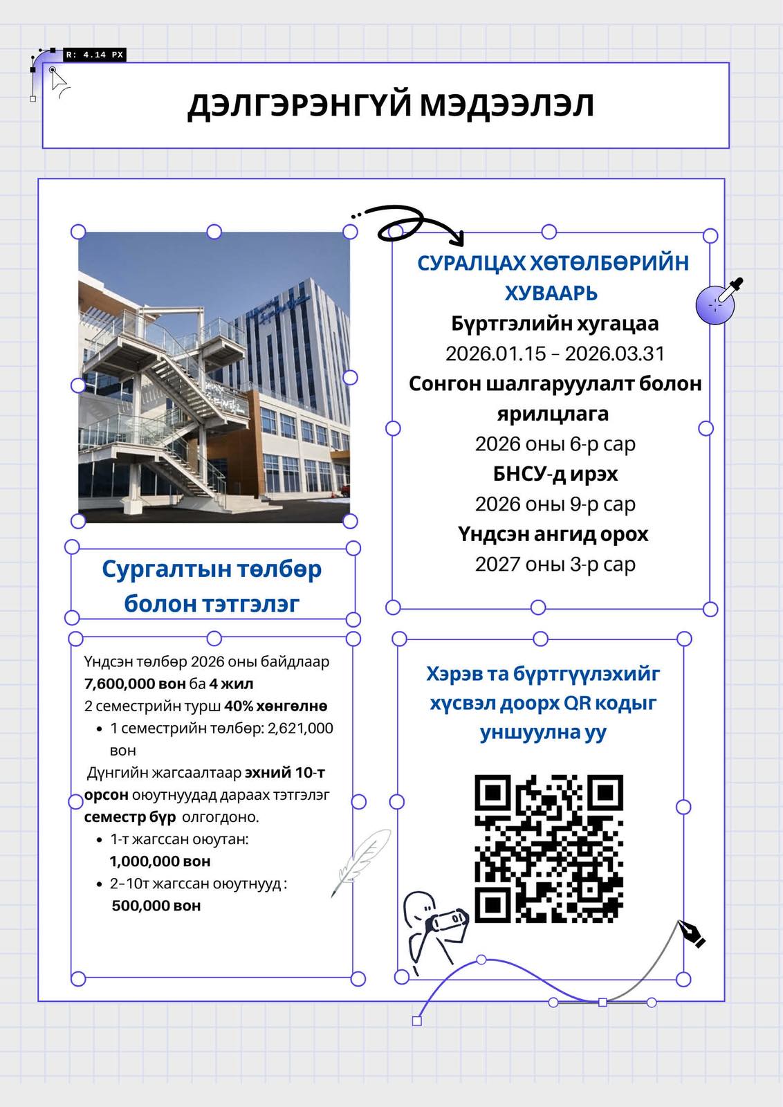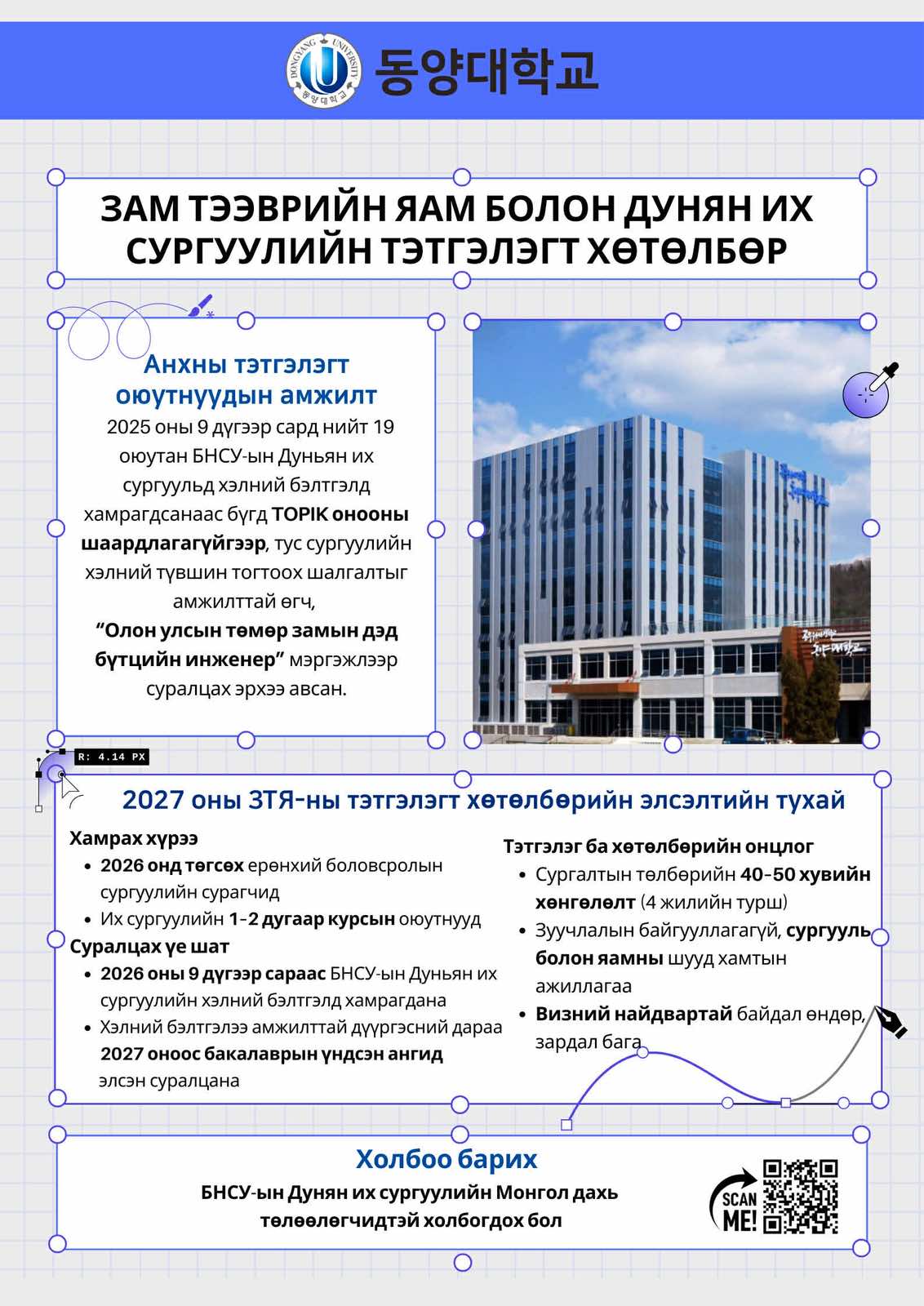 БНСУ-ын Дуньян их сургуулийн 2026-2027 оны хичээлийн жилийн бакалаврын тэтгэлэгт хөтөлбөрт бүртгэж эхэллээ. Уг тэтгэлэгт 30 оюутныг сонгон шалгаруулж, суралцуулна.