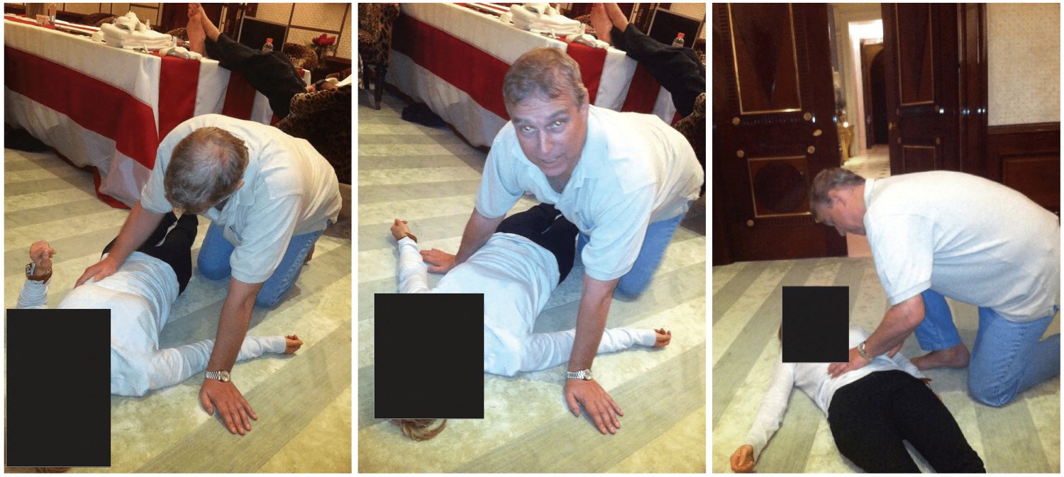 2015 онд Виржиниа Жюфре хэмээх эмэгтэй Эпштэйн түүнийг 17 насанд нь "массажист" нэрийн дор бэлгийн мөлжлөгт оруулж, өөр хүмүүстэй хүчээр бэлгийн харилцаанд орохыг шаардаж байсан хэмээн гомдол гаргасан. Тэдгээр хүмүүсийн дунд Их Британийн хаан Чарльзийн дүү Эндрю байсан гэсэн юм.
