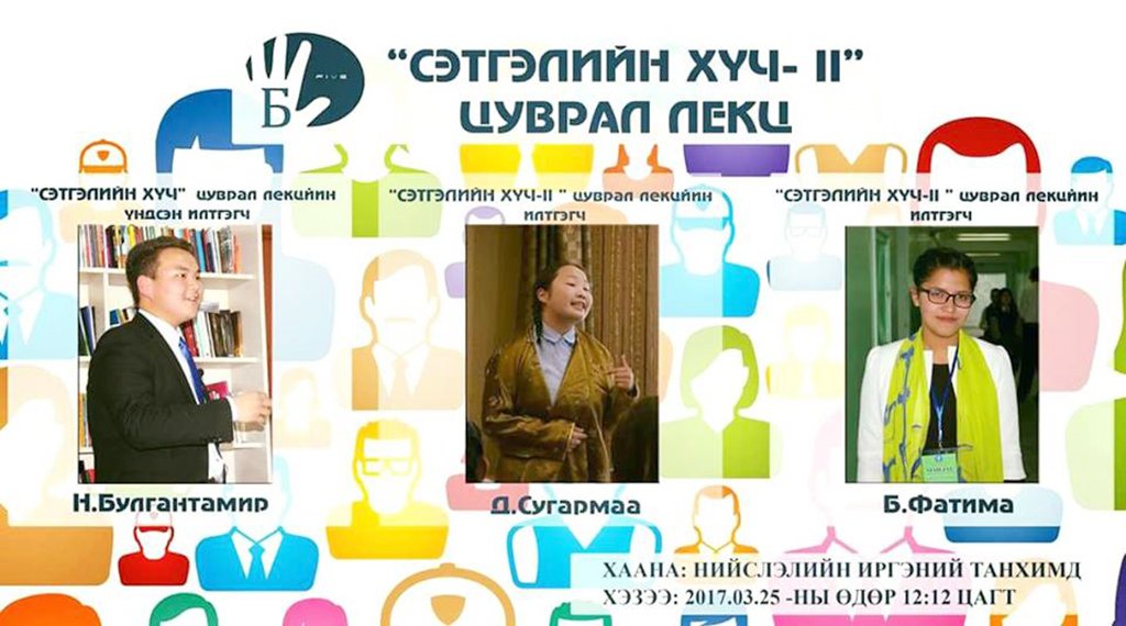 “Сэтгэлийн хүч I” лекц 2016 онд анх зохион байгуулагдахад зочин илтгэгчээр оролцож байлаа. Бид тухайн лекцийнхээ үндсэн дээр Халдвар судлалын хүүхдийн сүрьеэгийн тасагт номын сан байгуулсан. Саяхан “Сэтгэлийн хүч 2” лекц маань амжилттай зохион байгуулагдлаа. Уг лекцэнд гурван илтгэгч өөр өөрийн илтгэлийг хэлэлцүүлсэн. Миний хувьд илтгэх урлаг намайг хэрхэн өөрчилсөн тухай, илтгэх урлагтай холбоотой олон гайхалтай дурсамжуудаа хуваалцсан.