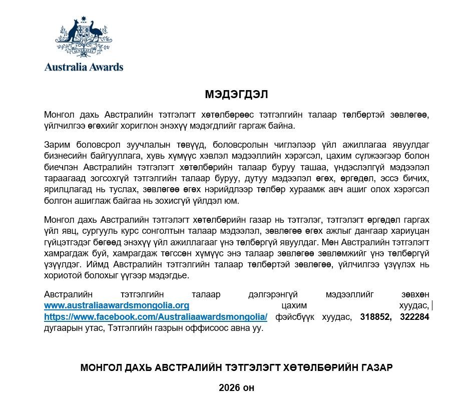 Тэгвэл Монгол дахь Австралийн тэтгэлэгт хөтөлбөрийн газраас дараах мэдэгдлийг гаргажээ.