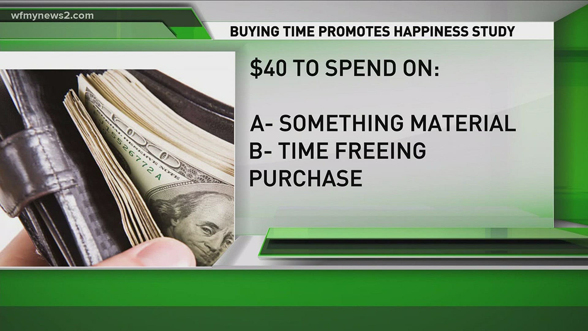 Туршилтын үр дүнд хүмүүс эд зүйл худалдаж авснаас илүүтэйгээр цаг хугацаа хожсон үедээ хавьгүй илүү аз жаргалтай байсан байна. Мөнгөөрөө гэр цэвэрлэх эсвэл хоол хийх гэх мэт өөрийнх нь дургүй, ядаргаатай ажлыг бусдаар хийлгэсэн хүмүүс "цаг хугацааны дарамт"-аас ангижирч, сэтгэл санаа нь илүү тайван байжээ.