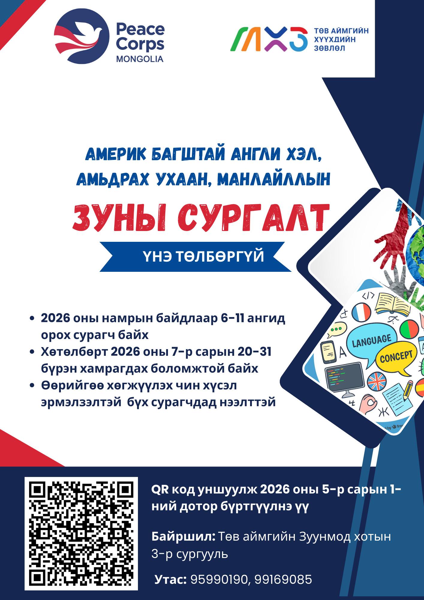 Монгол дахь Энх Тайвны Корпус нь "Америк багштай Англи хэл, Амьдрах ухааны зуны сургалт"-ийг 2 долоо хоногийн турш ҮНЭ ТӨЛБӨРГҮЙ зохион байгуулах гэж байна.