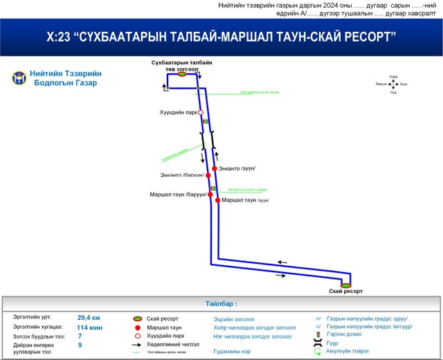Иргэдийг цэвэр агаарт гарах боломжийг бүрдүүлж Х:23 Сүхбаатарын талбай-Маршал таун-Скай ресорт чиглэлд 4 сарын хугацаанд үйлчилсэн.