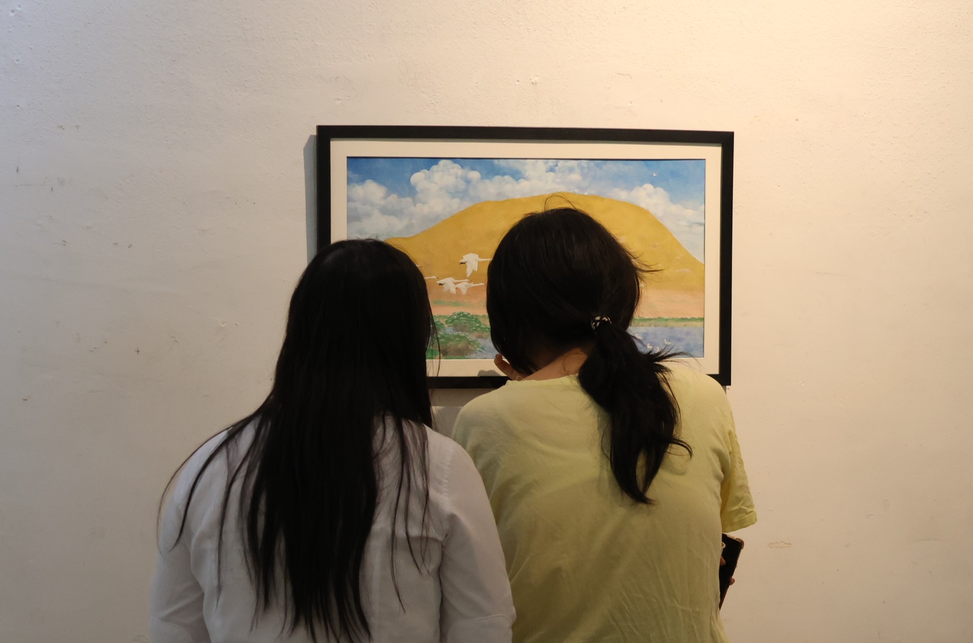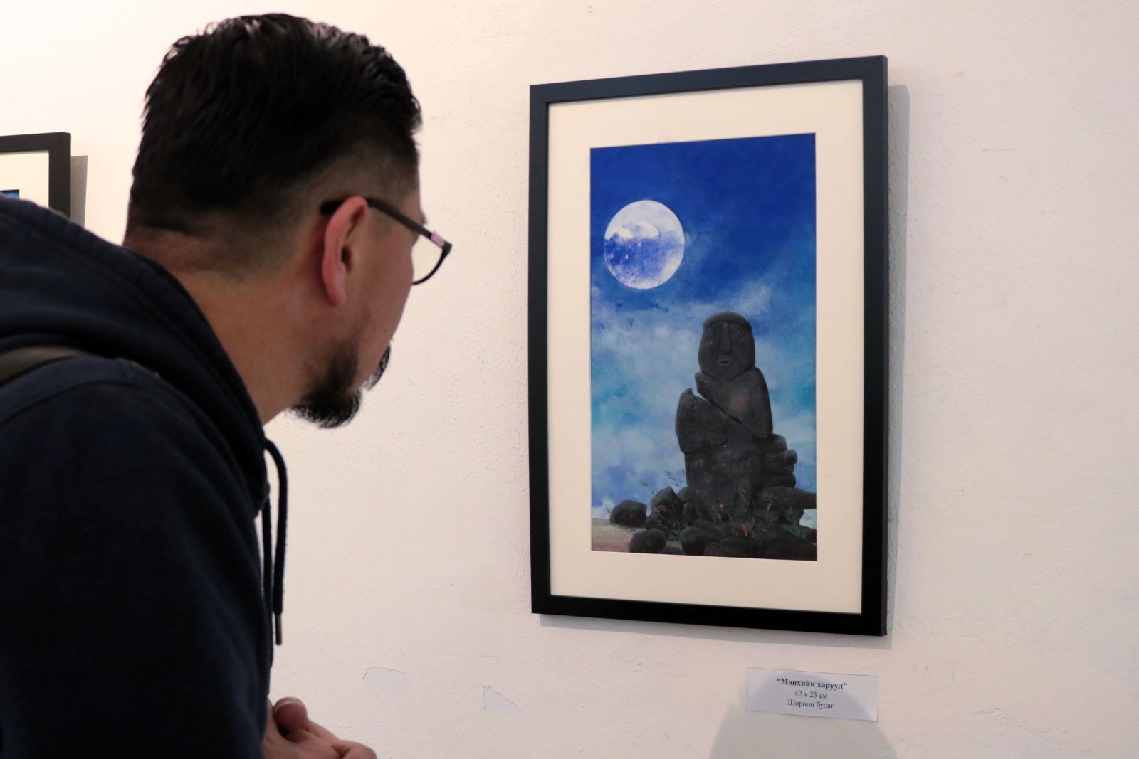 “Эргэх цэг” үзэсгэлэнд оролцож буй бүтээлүүдийг шороо болон ургамлын будгаар дагнаж зуржээ.
