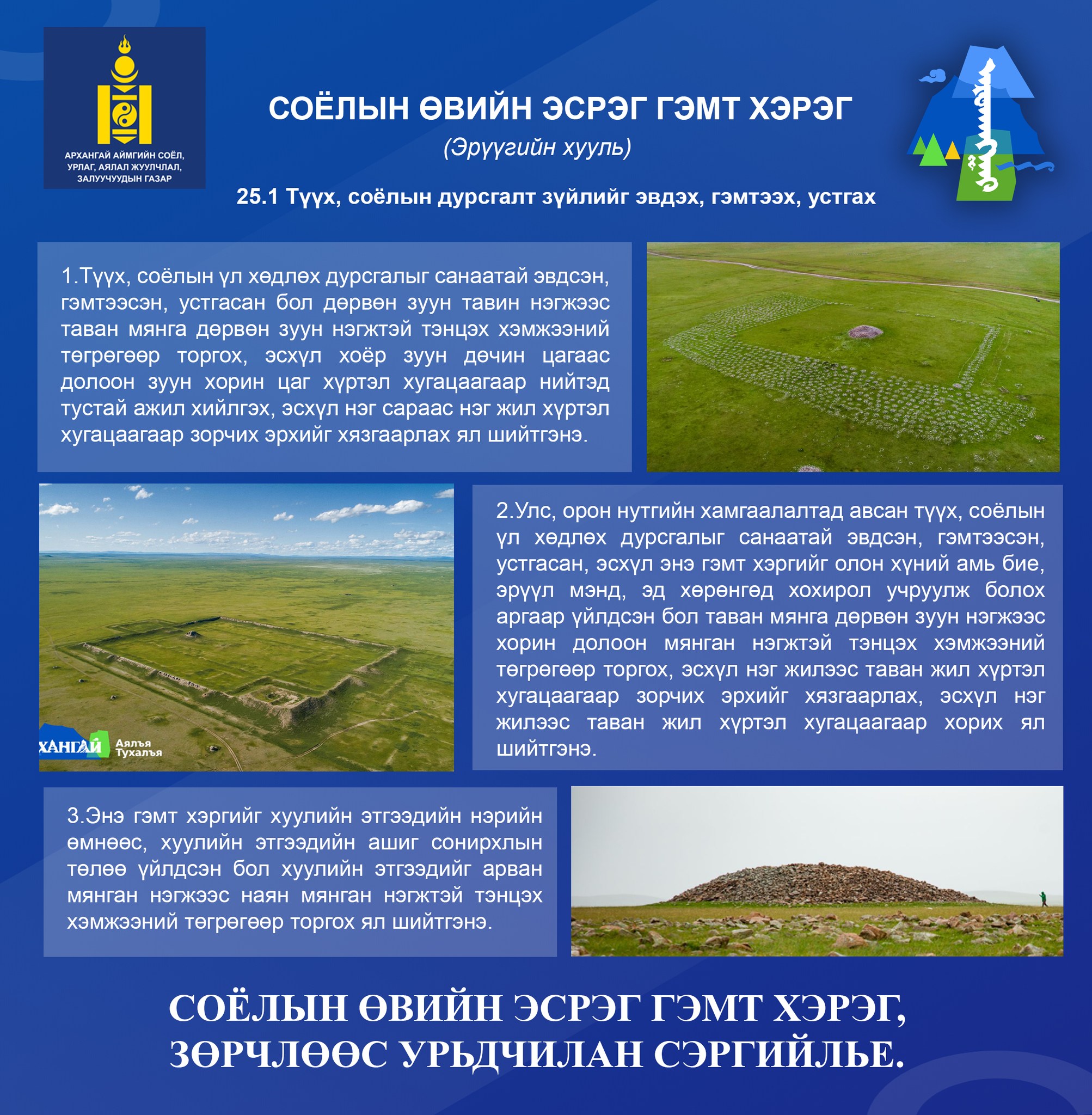 - Мэдээлэх: Олсон өвийг байрнаас нь хөдөлгөлгүйгээр, шууд харьяа сум, дүүргийн Засаг дарга, соёлын асуудал эрхэлсэн төрийн захиргааны байгууллагад мэдэгдэх.