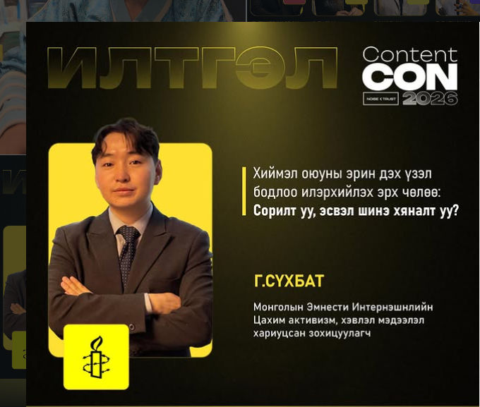 Дэлхийн 100 гаруй оронд үйл ажиллагаа явуулдаг "Amnesty International" байгууллагын Г.Сүхбат хиймэл оюун ухааны нөлөө болон хүний эрхтэй холбоотой асуудлуудтай холбоотой илтгэл хэлэлцүүлэв.