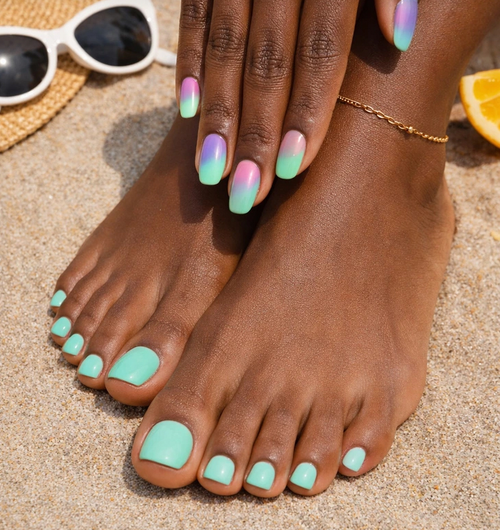 Гарын хумсанд сүүн өнгө, хөлийн хумсанд дулаан карамел өнгө хослуулах нь энгийн хэрнээ маш дэгжин харагддаг. Сүүн өнгө нь гарыг эрүүл, гэрэлтсэн харагдуулж, карамел өнгө нь суурийг тогтоож зөөлөн, эмэгтэйлэг мэдрэмж өгнө. Хамгийн чухал нь карамел өнгөө зөв сонгох, үгүй бол дулаан биш, бүдэг харагдаж болно.