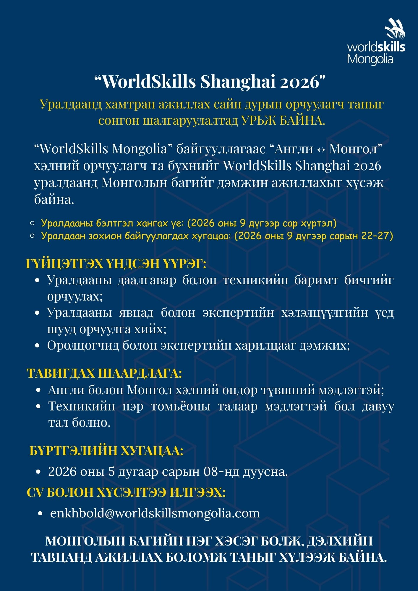 “WorldSkills Mongolia” байгууллагаас “Англи Монгол” хэлний орчуулагч нарыг "WorldSkills Shanghai 2026" уралдаанд Монголын багийг дэмжин ажиллахыг хүслээ.