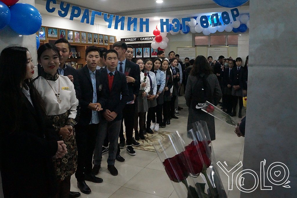 Багш нарыгаа угтан баяр хүргэх гэж сургуулийн үүднээс шат хүртэл урт эгнээ болон догдлон зогсож буй ахлах ангийнхан. Тэдний хувьд ЕБС-ийн сүүлийн жил.