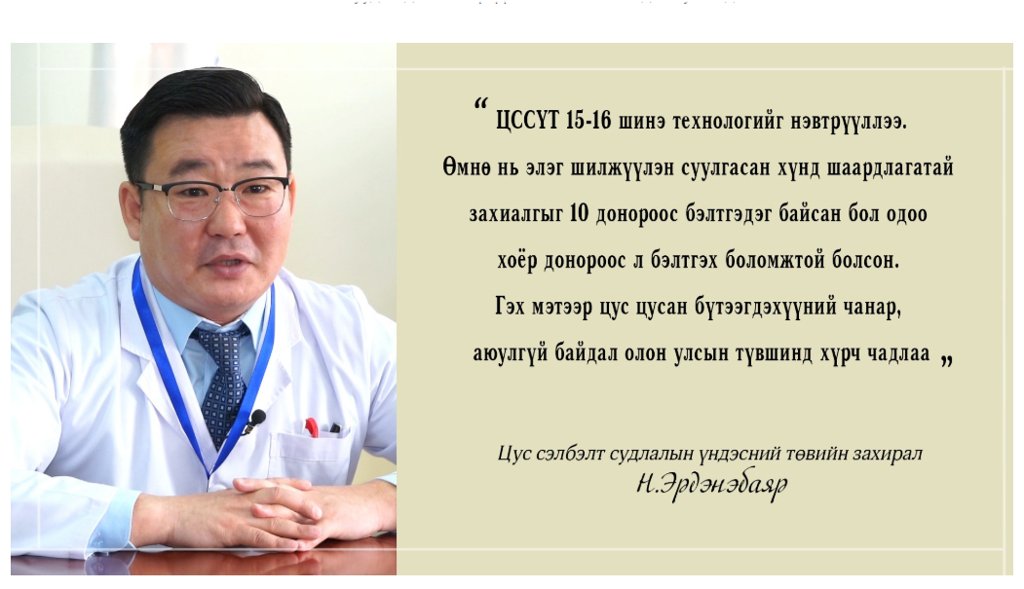-Манай хамт олон өндөр хөгжилтэй орнуудын цусны албанд хэрэглэдэг орчин үеийн, шинэ технологиудыг үйл ажиллагаандаа нэвтрүүлэх, эдгээр технологиудыг нутагшуулах ажлуудыг үр дүнтэй хийж байна. Тухайлбал АХБ-ны “Эрүүл мэндийн хөгжил хөтөлбөр V” төслийн хүрээнд ЦССҮТ болон орон нутгийн 26 салбар төвүүдийг цус цуглуулах, шинжлэх, үйлдвэрлэх, хадгалах, тээвэрлэх тоног төхөөрөмжөөр иж бүрэн хангахаас гадна байрны засвар шинэчлэл, дотоод үйл ажиллагааны урсгал зохион байгуулалтыг стандартын дагуу болгон шинэчлээд байна. Яг манай төвийн хэмжээнд нийтдээ 15-16 цоо шинэ технологийг нэвтрүүлсэн бөгөөд 2017-2018 онд эдгээр технологийг нутагшуулах ажлыг хийж байна. Ингэснээр цус цусан бүтээгдэхүүний чанар, аюулгүй байдал олон улсын түвшинд хүрч чадлаа.
