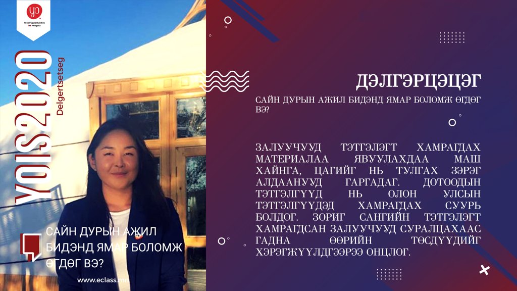 "YOIS 2020" олон улсын арга хэмжээ Монгол улсад хоёр дахь жилдээ зохион байгуулагдах гэж байна. Үүнтэй холбогдуулан өөрийгөө хөгжүүлэхийг хүсч буй 13-35 насны залуус та бүхэнд уг арга хэмжээнд уригдан оролцох гэж буй дэлхийн шилдэг их, дээд сургууль болон хөтөлбөрүүдэд хамрагдсан залуусын туршлага, зөвлөгөөг хүргэж байна.