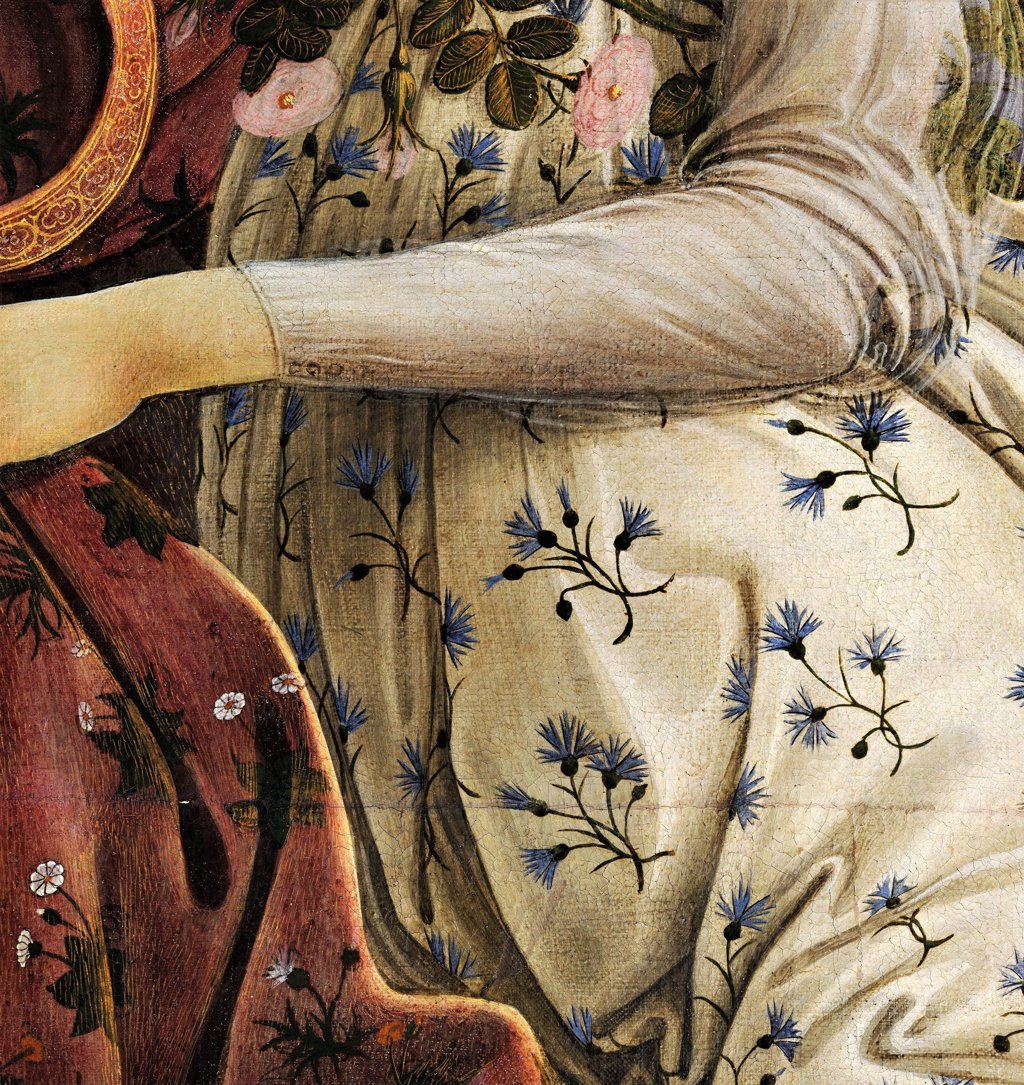 Флорагийн даашинз дээр байгаа гүн хөх өнгийг хөхөнгөр хэмээх хагас үнэт чулууг нунтаглан хийсэн үнэтэй нөсөөнөөс гаргаж авдаг. Үүнээс энэ зургийг захиалагч хөрөнгө харамлаагүй гэдэг нь илэрхий юм.