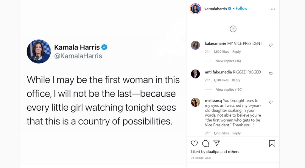 Ингэснээр Kamala Harris АНУ-ын түүхэн дэх анхны өнгөт арьстай, эмэгтэй дэд Ерөнхийлөгч болж буй юм. Тэрээр албан үүргээ хүлээж авсныхаа дараа дараах нийтлэлийг Инстаграм хуудаснаа хуваалцжээ.