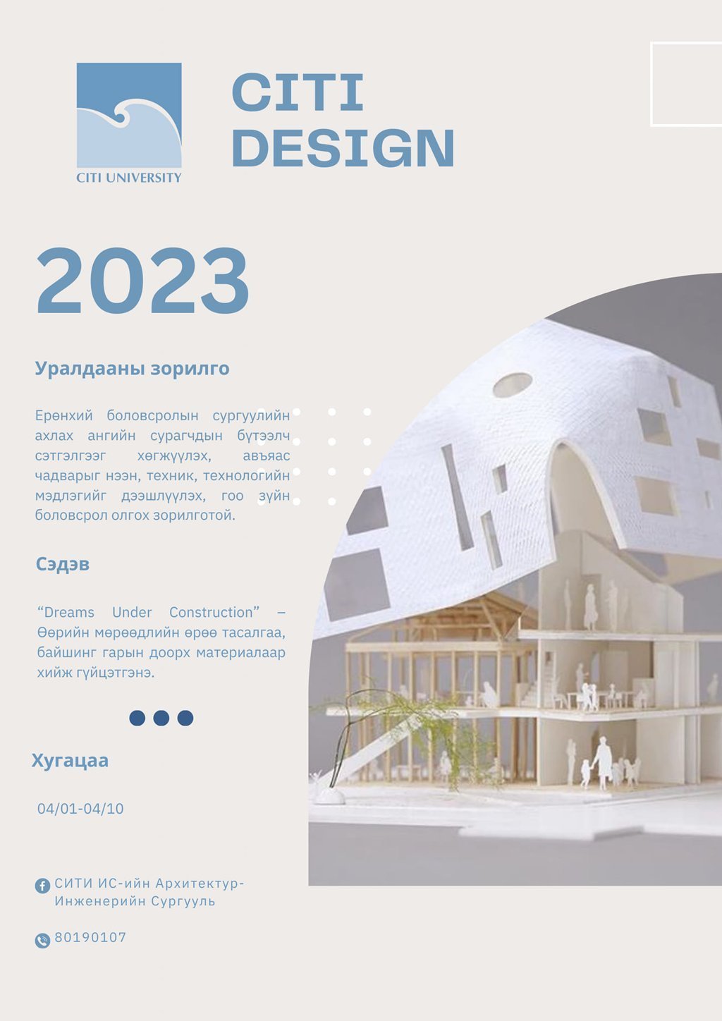 “СИТИ” Их сургуулийн бүрэлдэхүүн Дизайны сургуулиас жил бүр Ерөнхий боловсролын сургуулийн 10-12 дугаар ангийн сурагчдын дунд “СИТИ ДИЗАЙН” уралдаан зохион байгуулдаг билээ. “СИТИ ДИЗАЙН 2023” уралдаан нь цаасны үр ашиггүй хэрэглээнээс татгалзан "Модоо хайрлая” уриан дор цахимаар зохион байгуулагдаж байгаараа онцлог юм.